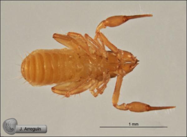 Vista ventral de pseudoescorpión de la familia Chthoniidae.